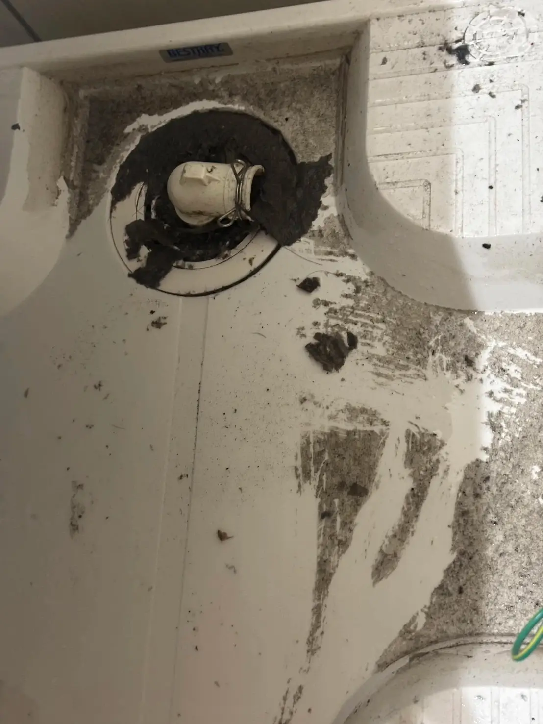 現場に到着後、排水の流れを確認したところ、洗濯機排水口の内部で繊維カスと洗剤カスが固着し、排水を塞いでいる状態でした。
