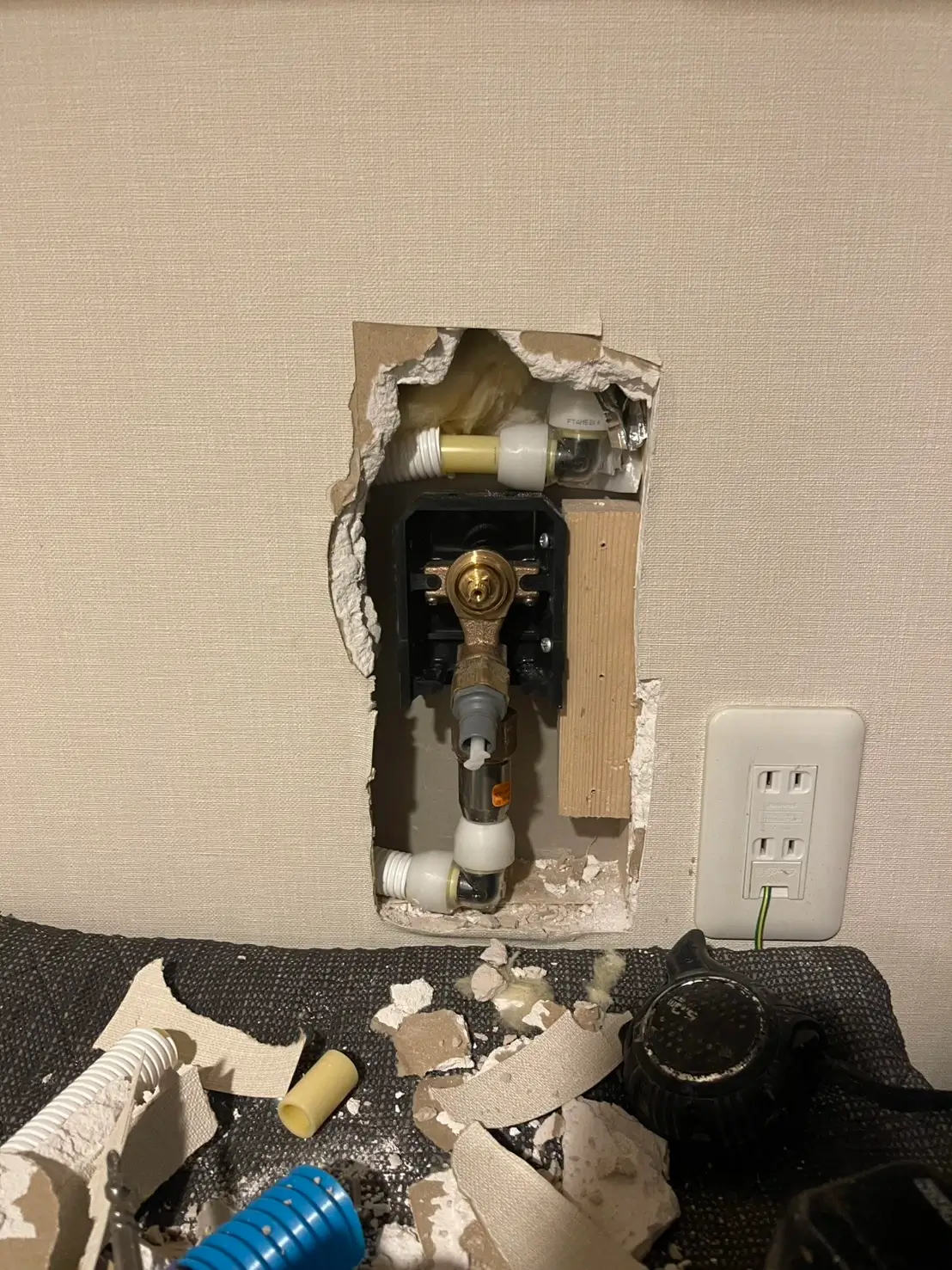 お客様のご希望もあり、見た目がすっきりして使いやすいビルドインタイプの洗濯水栓に交換いたしました。