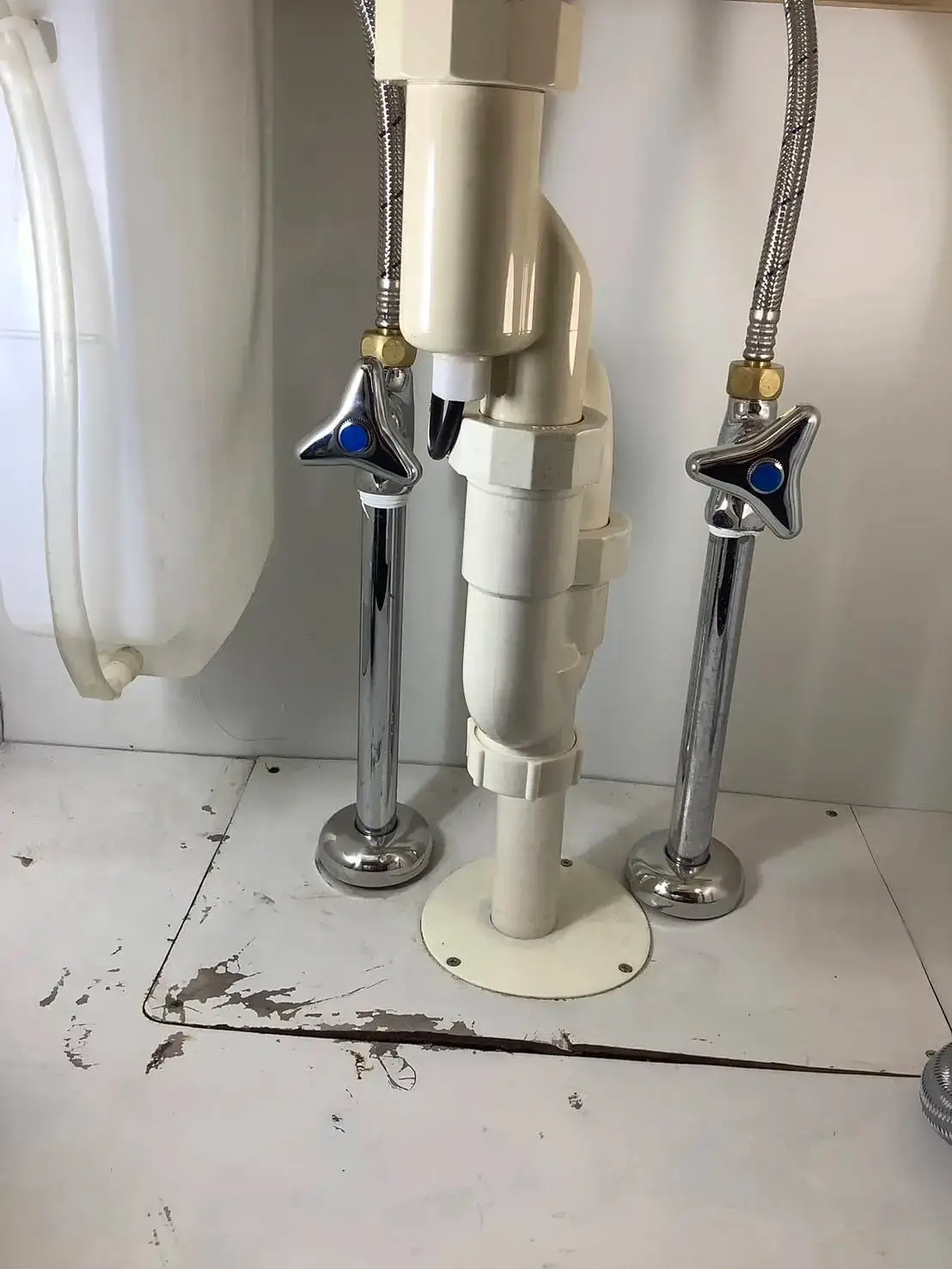 現場確認の結果、排水管まわりの劣化に加え、給水部材にも負担がかかっている状態でした。