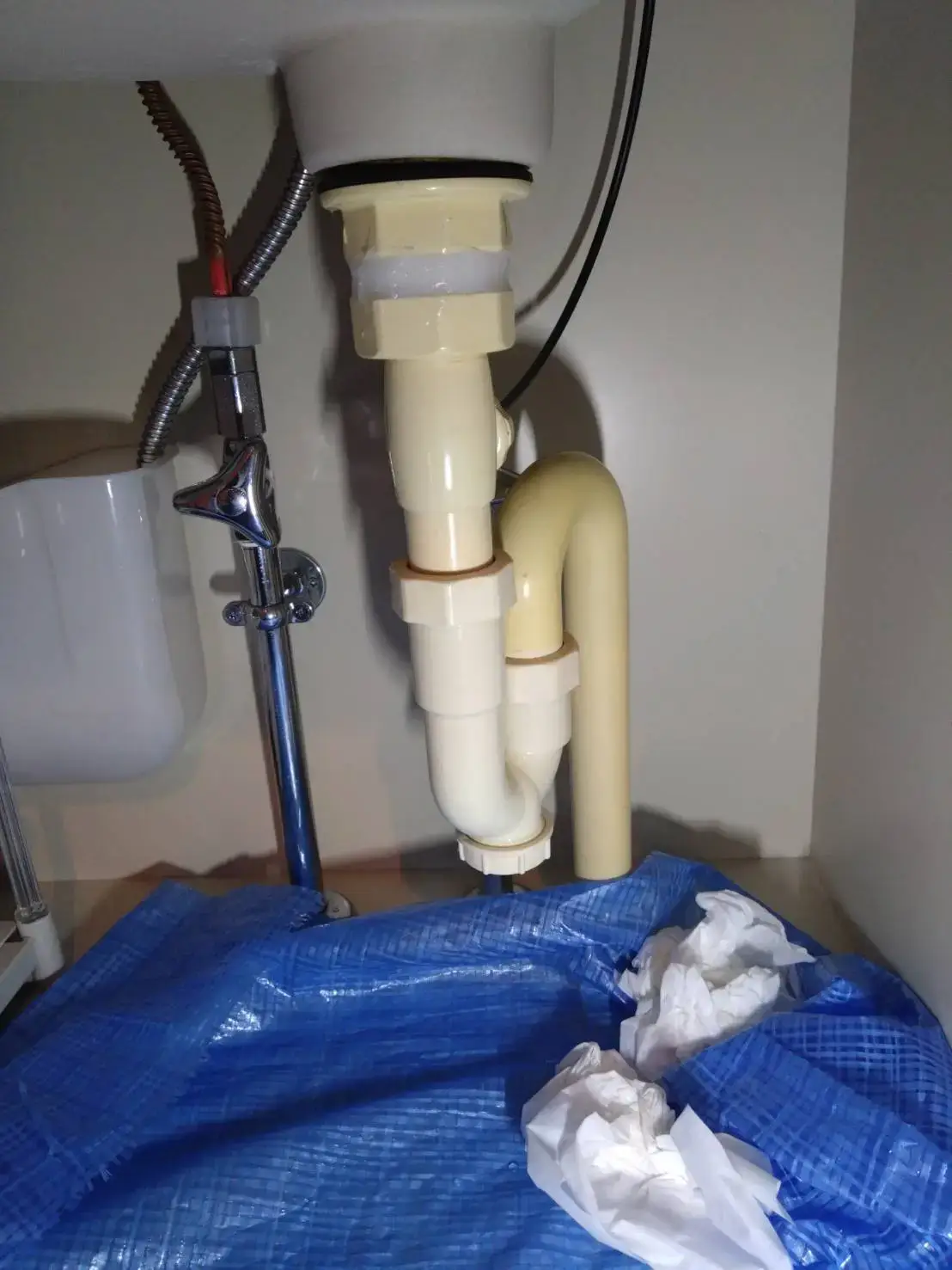 最初は何が原因かわからず不安でしたが、排水管から水漏れしているようだったので、すぐに洗面所専門チームさんへ連絡しました。